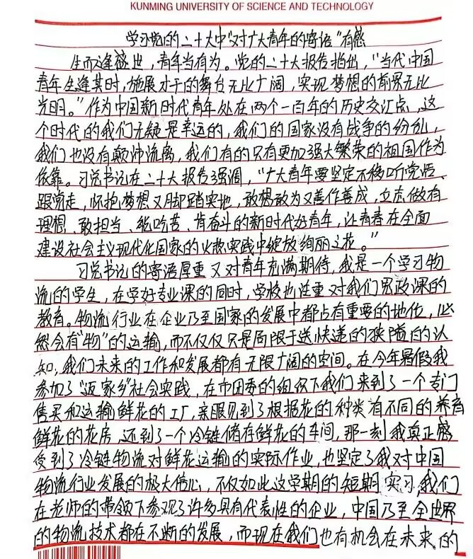 习总书记在党的二十大报告中强调:“广大青年要坚定不移听党话、跟党走,怀抱梦想又脚踏实地,敢想敢为又善作善成,立志做有理想、敢担当、能吃苦、肯奋斗的新时代好青年。”这是新时代对团员青年的呼唤,更是对团员青年的要求。青年强,则国家强。当代青年生逢其时,施展才干的舞台无比广阔,实现梦想的前景无比光明。学院们结合自身专业特点、生活实际进行交流,手写学习感悟,深刻感悟习近平总书记对青年的殷切希望与嘱托。
