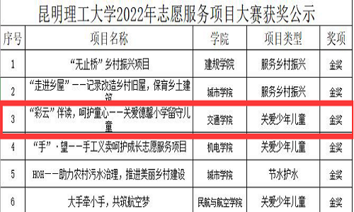 在本次大赛中,交通院团委积极组织学院青协、社团等院内组织及同学积极申报。经过资格筛查、专家培训、申报打磨、层层筛选,交通院推荐《“彩云”伴读,呵护童心——关爱德馨小学留守儿童》项目成功进入校内决赛答辩环节。经过激烈的答辩环节,本项目从进入决赛的27个项目中脱颖而出,斩获金奖。