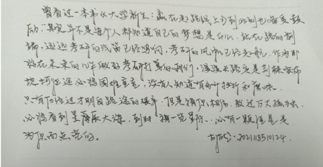 本次活动分为两个部分,分别为考研旧书线下捐赠交流活动和线上考研期望及经验分享活动。2018级毕业生书写感想,将自己的考研经验分享给低年级的学生,有效的增强了大学生的理想信念教育,切实发挥好传帮带的作用。同时调动了低年级学生的学习积极性,让2021级新生更加坚定自己的学习目标。