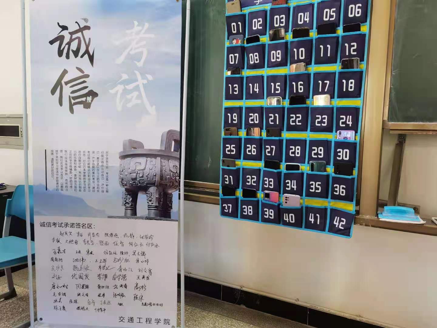 在无人监考考场中,讲台一侧立有带所有考生签名的《诚信考试承诺书》,同时讲台上还设有手机袋方便同学们考试前放置手机。考试过程井然有序,同学们按照《漫蛙漫画