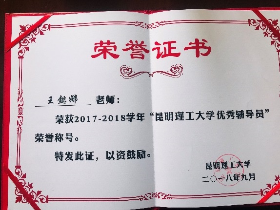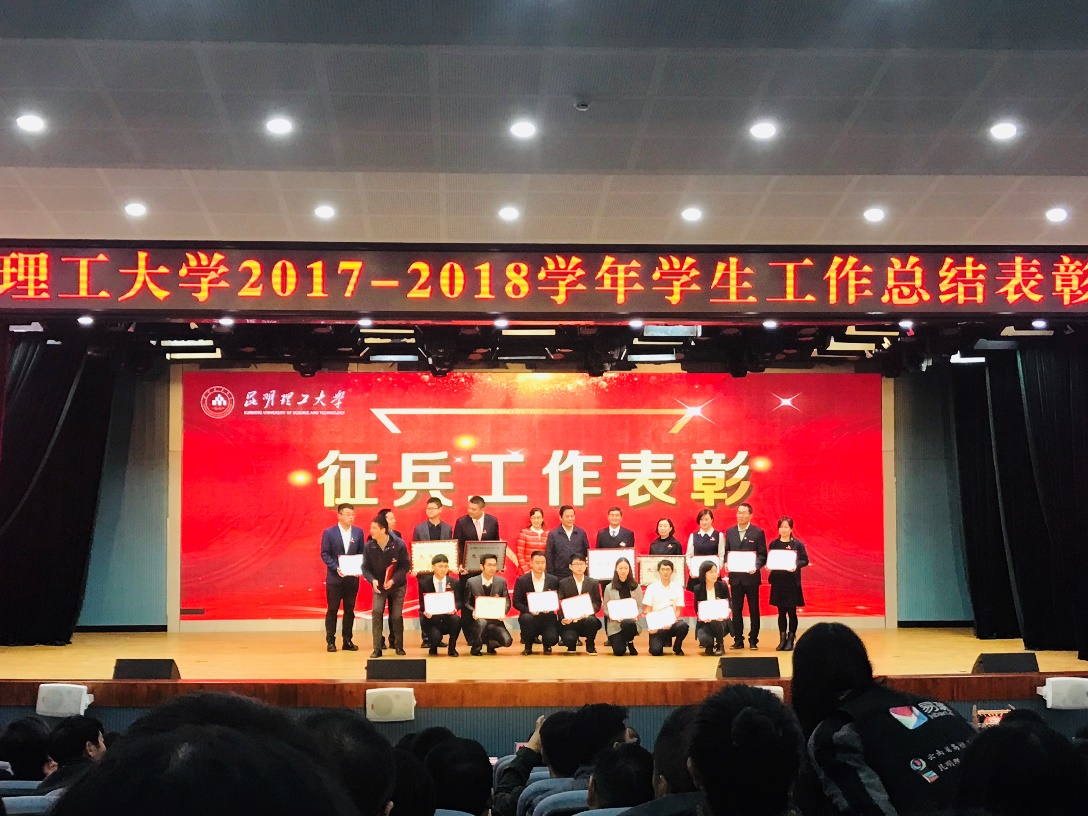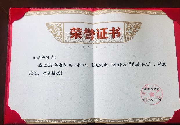 2018年兵工作“先进单位”表彰,党委副书记张强同志荣获征兵工作“先进个人”称号,学工办主任王懿娜同志荣获校级“优秀辅导员”称号、征兵工作“先进个人”称号。