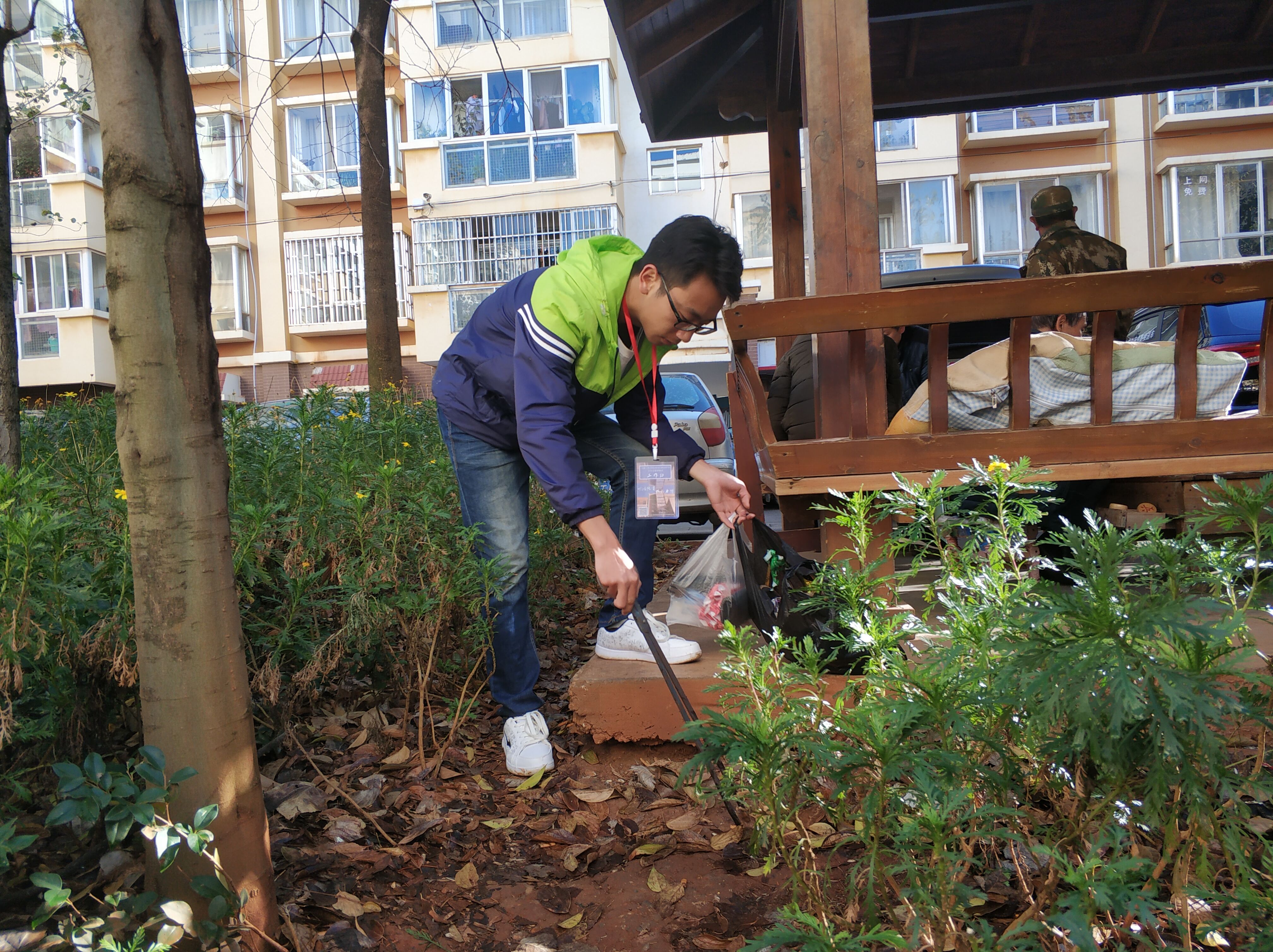 (图中志愿者正在清理绿化带中的垃圾)
