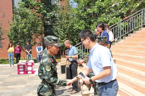 在交通楼广场对2018级的教官与新生进行慰问。出席此次慰问活动的人员有交通院党委书记马旭东、党委副书记张强、学生工作办公室主任王懿娜、团委负责人晁洁、2018级辅导员寸议鹏、武警机动第八支队副参谋长李永林中校、武警机动第八支队五大队副队长田万良少校、张小飞、蒋晓龙班长以及军训的教官和2018级全体参训新生。